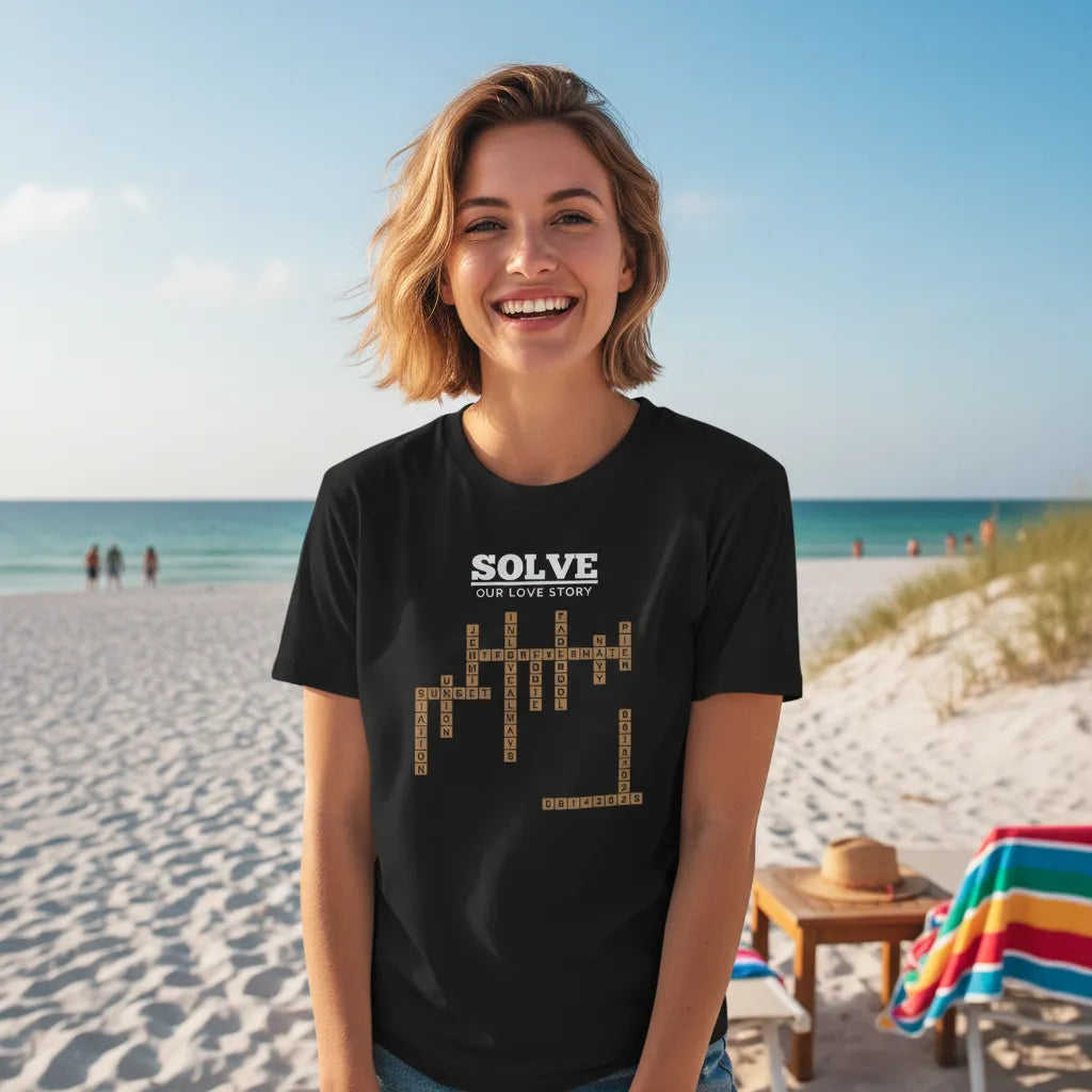 This adorable tee turns your favorite memories (names, dates, places, nicknames, inside jokes) into a wearable crossword puzzle—perfect for anniversaries, engagements, weddings, Valentine’s Day, or “just because.”