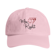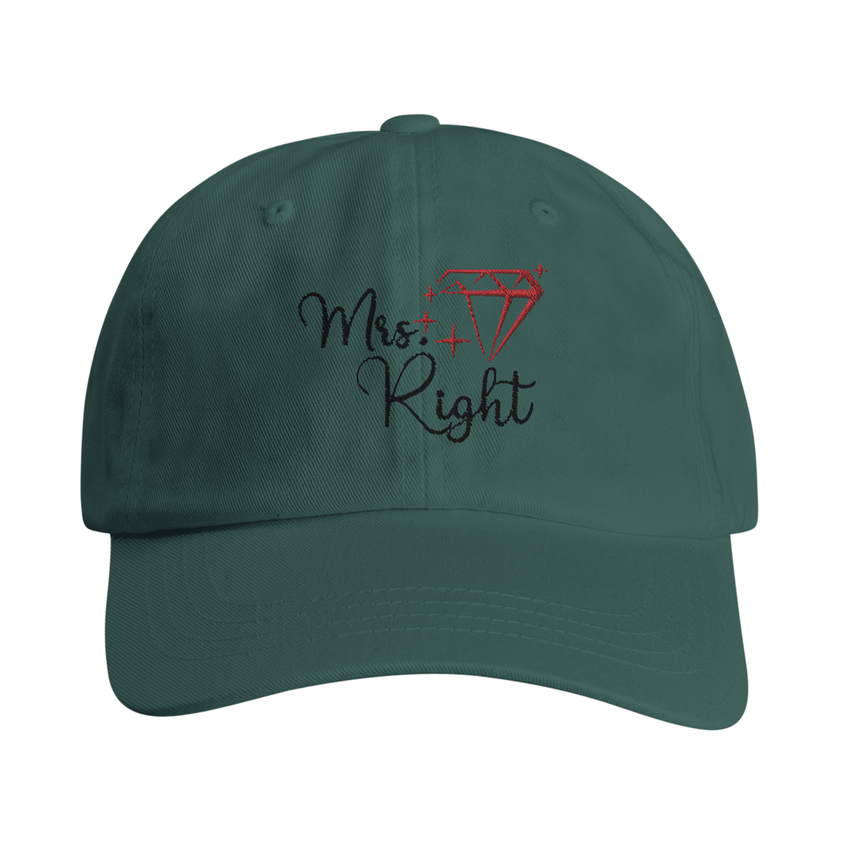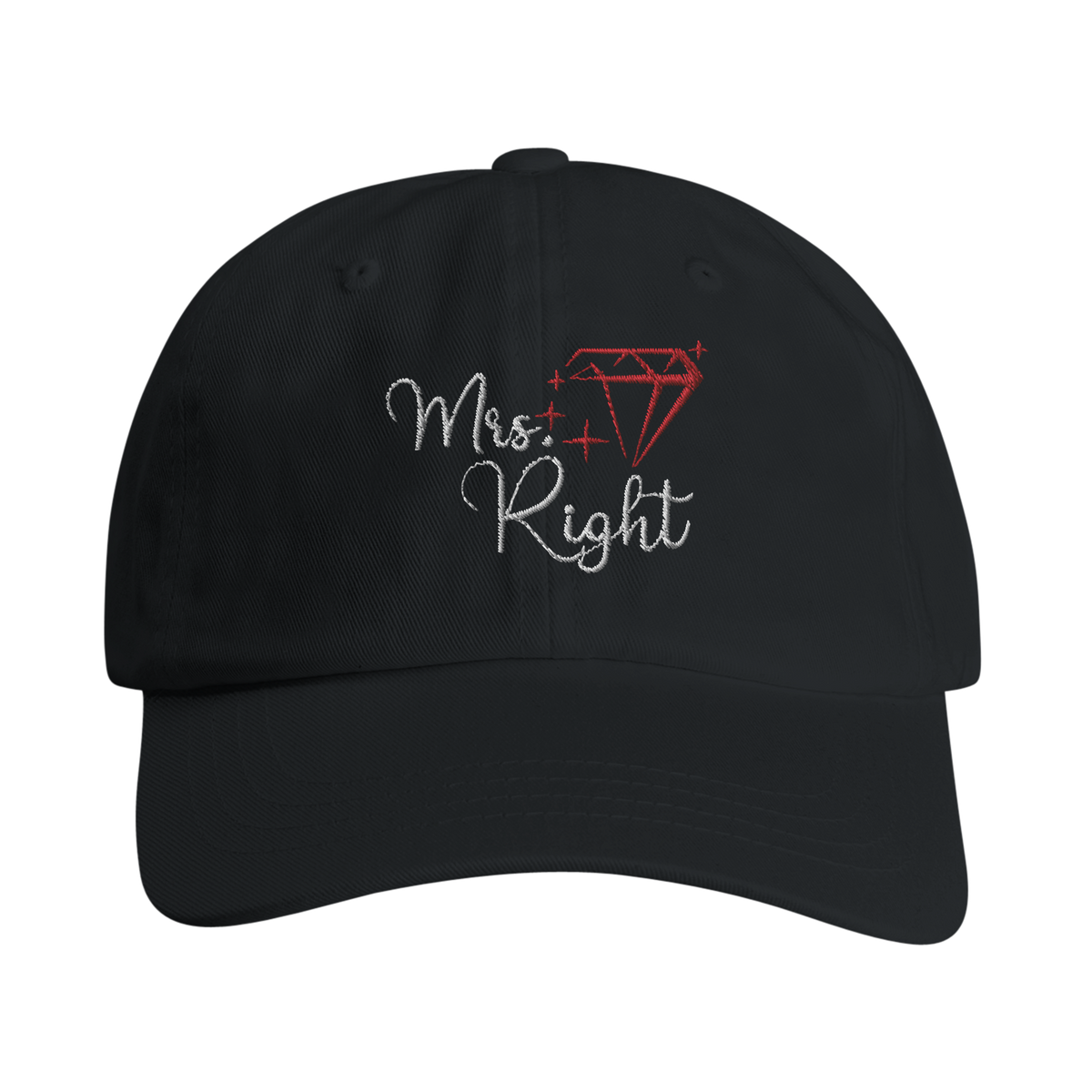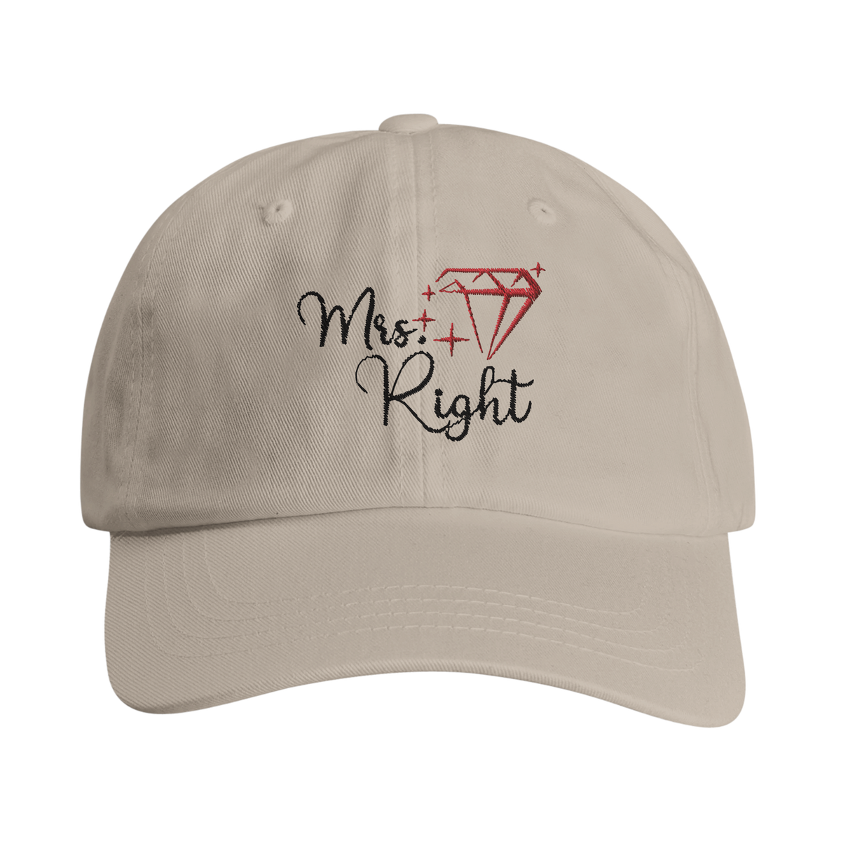 Featuring the playful 'Mrs. Right' embroidered, this cotton twill cap is not just a statement piece; it's crafted for comfort and versatility, making it perfect for any outing.